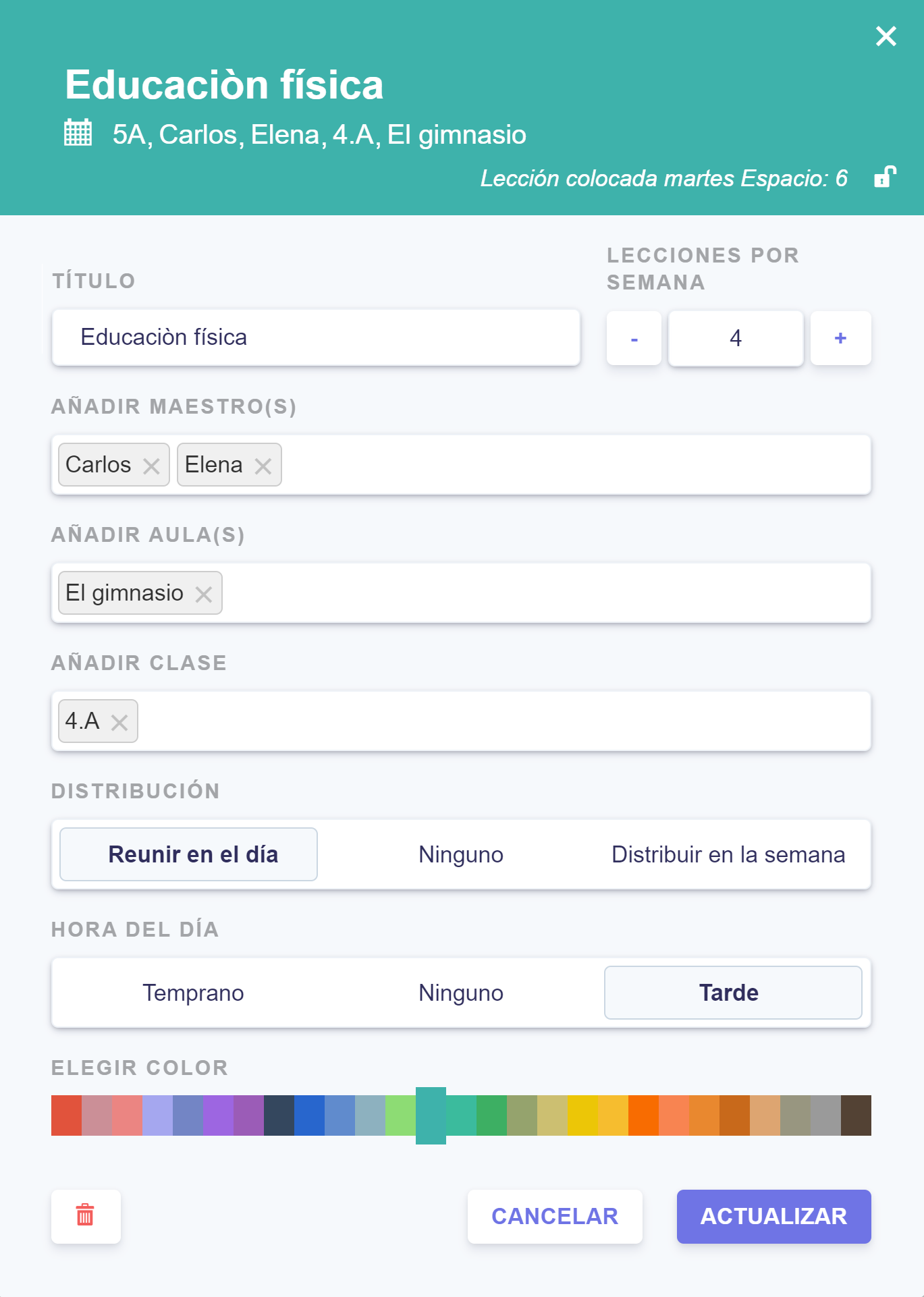 Y, si alguna de las clases requiere un maestro extra, entonces cree simplemente una asignatura extra